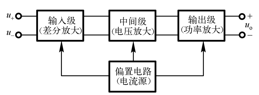 输入级由差分放大电路构成,主要是为了提高电路抑制温度漂移的能力。温度漂移是指当温度、电源电压等参数变化时,电路的直流工作点随温度而缓慢变化的现象,它将会使整个电路工作不稳定。中间级的主要作用是提供大的电压增益,一般为多级放大电路。输出级的主要作用是为负载提供一定的功率,应具有较强的带负载能力。偏置电路的作用主要是为各级放大电路提供稳定的直流工作点,通常由恒流源电路实现。