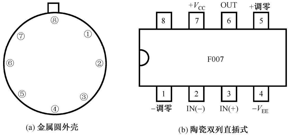 对于使用者来说需要知道运放的各个引脚的功能和运放的主要参数,这些可以通过查手册得到。通用型集成运放F007被认为是早期发展阶段集成运放电路的一个范例,F007是国内型号,对应国外同类产品的型号为μA741,有金属圆外壳和陶瓷双列直插式封装两种类型,辨认圆形外壳封装元件的引脚时,应将引脚朝上,外壳突出处的引脚为第8脚,其他引脚则按顺时针方向从1~7顺序排列。辨认双列直插式封装元件的引脚时,应将元件正面放置,即引脚朝下,将正面的半圆标记置于左边,从左下角开始逆时针方向从1~8顺序排列。