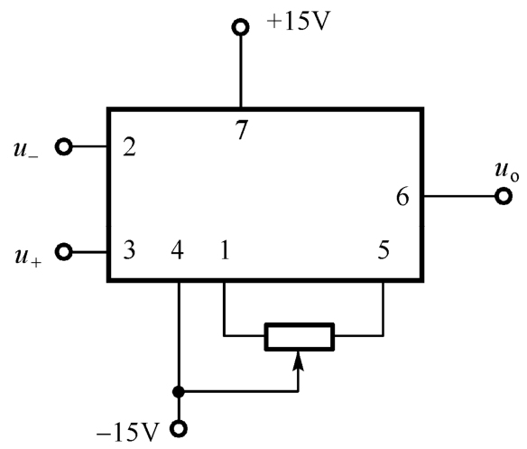 对照图4.2.4,F007的7个引出脚分别为:7脚接正电源+Vcc,4脚接负电源-VEE,1脚和5脚之间接调零电位器,6脚为输出脚,2脚为反相输入端,3脚为同相输入端。