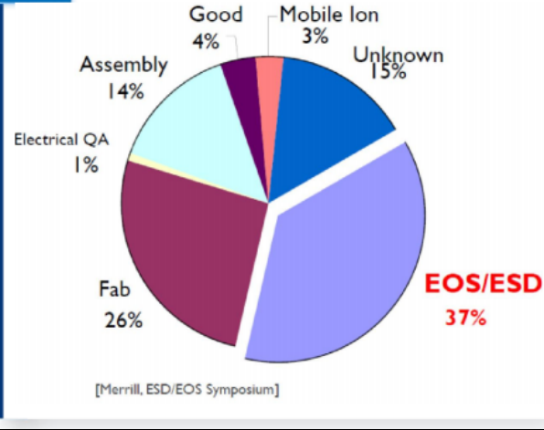图2 Merril ESD/EOS symposium报告指出,37%的电子元件失效由EOS/ESD引发,集成电路领域这一比例接近40%。在7nm以下工艺中,由于器件尺寸接近原子级别,ESD导致的软失效(如阈值电压漂移)占比从传统工艺的10%升至25%,成为可靠性测试的重点。